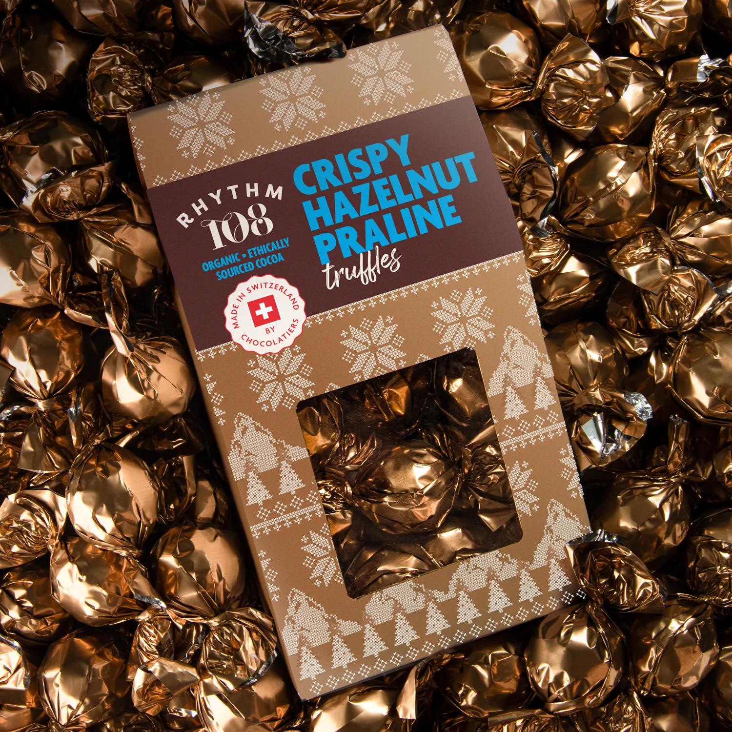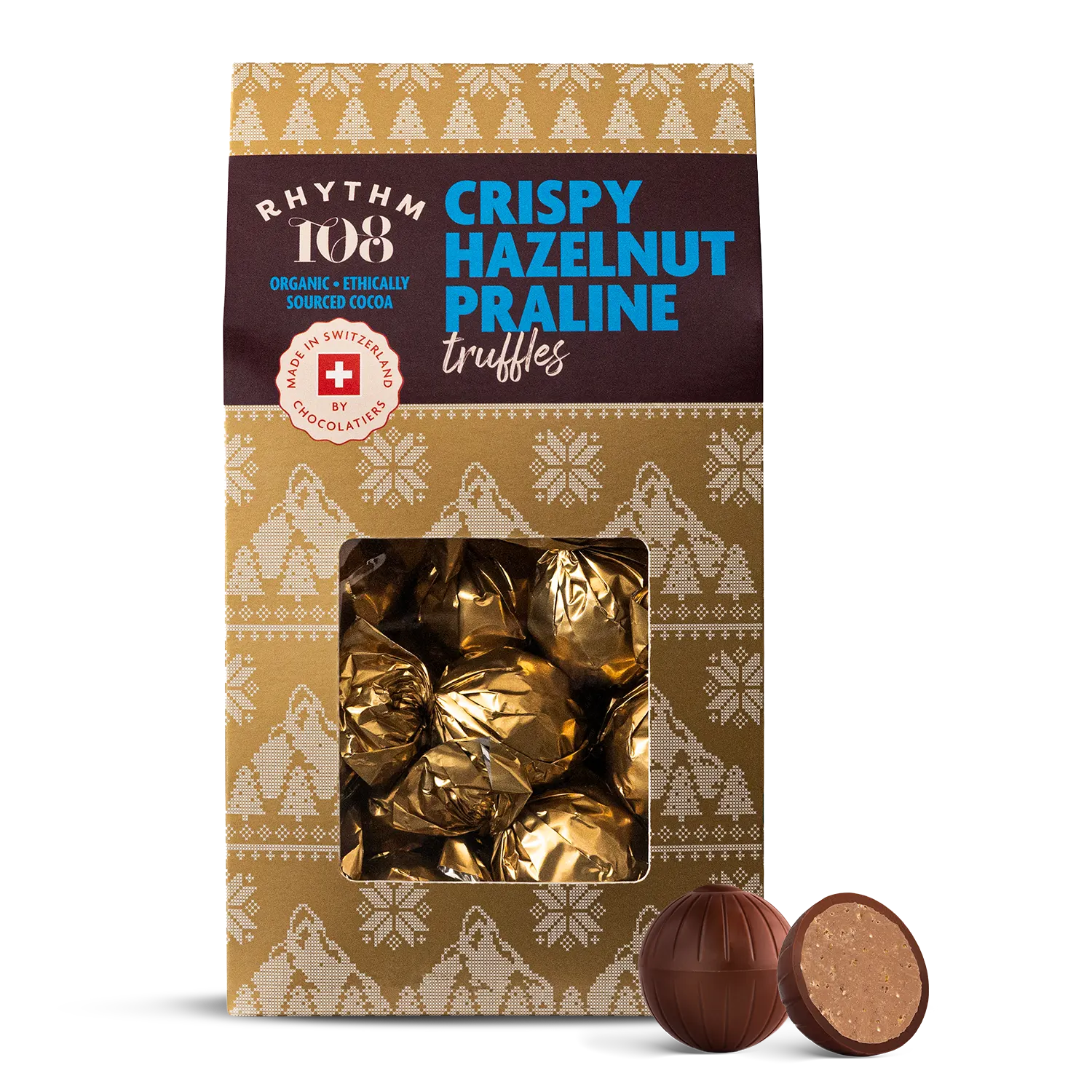 Each truffle is encased in velvety Swiss chocolate and filled with a silky hazelnut-cocoa centre, delicately flecked with crispy pieces.