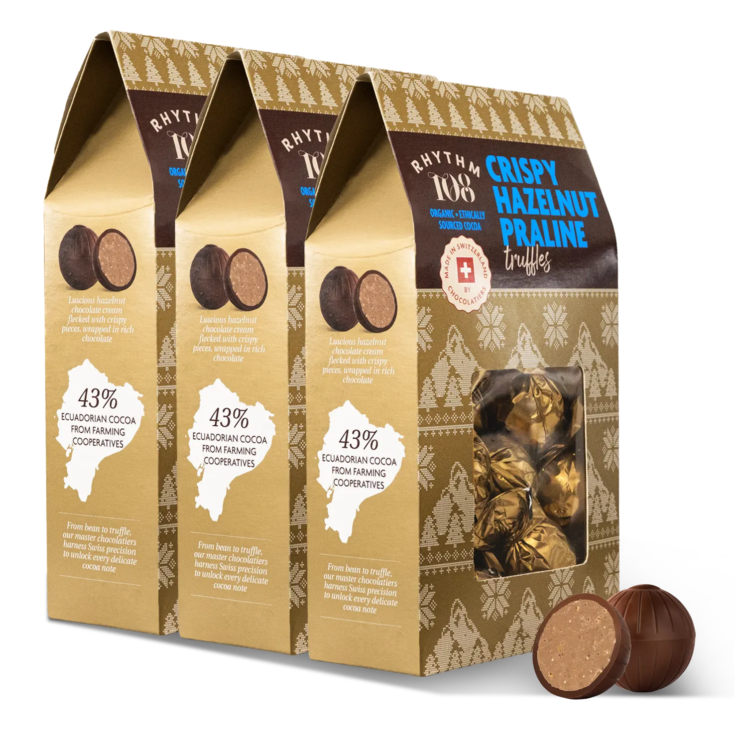 Each truffle is encased in velvety Swiss chocolate and filled with a silky hazelnut-cocoa centre, delicately flecked with crispy pieces.